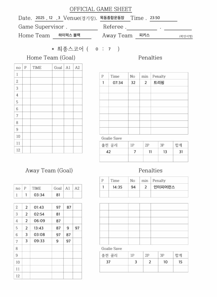 수원 아이스하우스 피키스 vs 하이퍽스 블랙 |